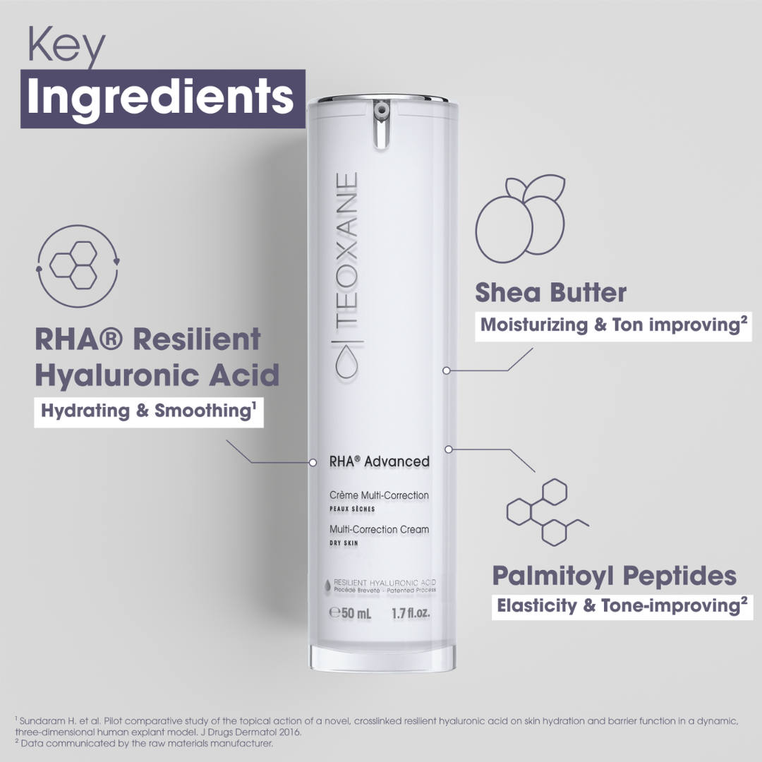 RHA® Advanced is a moisturizer specifically formulated for dry skin and design to hydrate and visibly smooth the appearance of fine lines and wrinkles. Powered by Teoxane’s exclusive RHA® (Resilient Hyaluronic Acid), it helps strengthening the skin's natural barrier and provide long-lasting hydration.¹⁻²