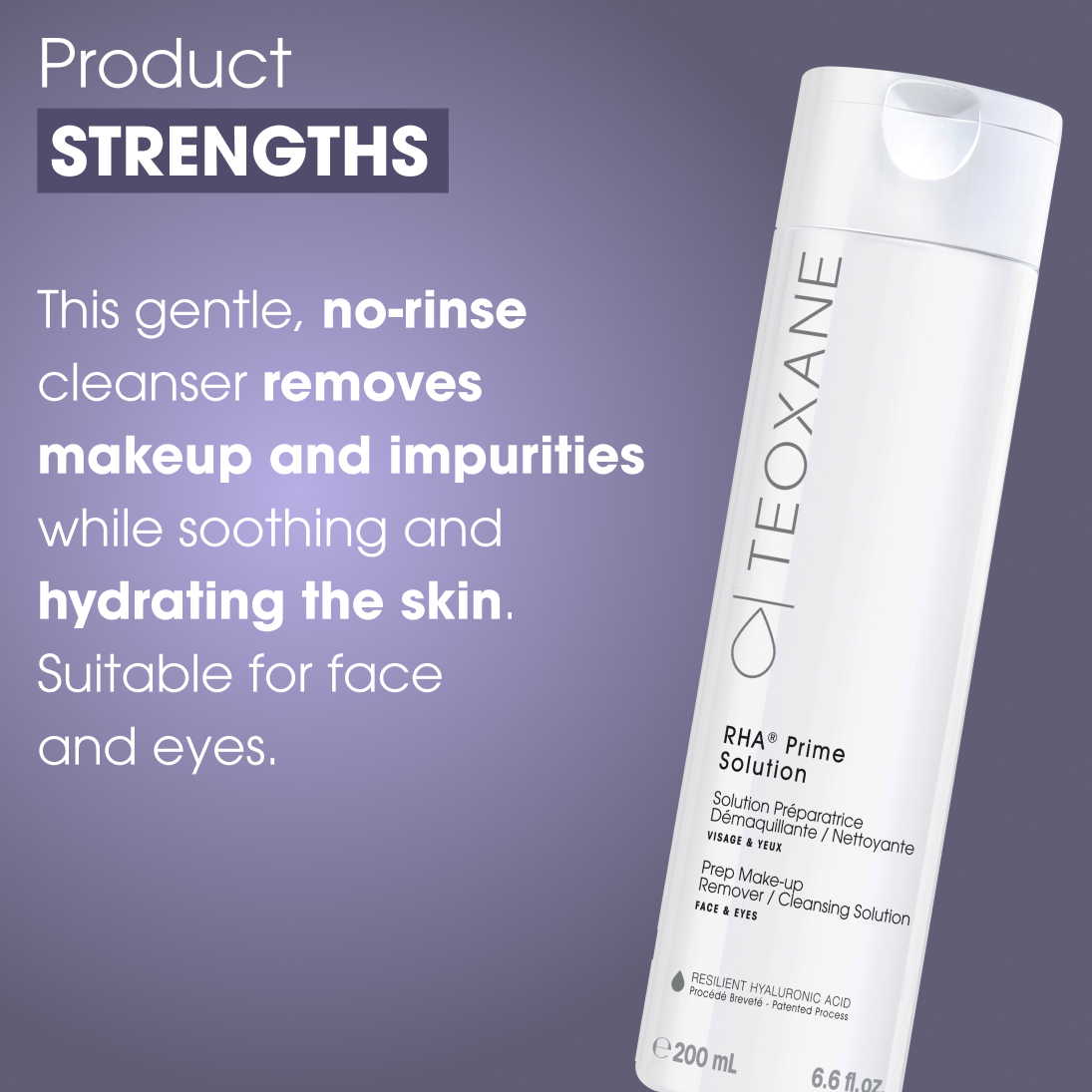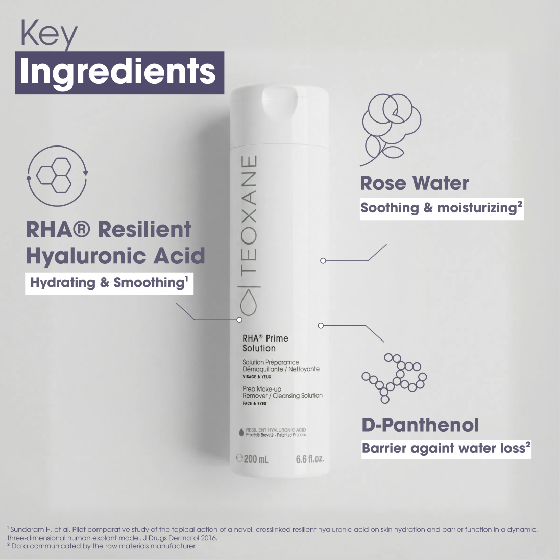 RHA® Prime Solution is a gentle, no-rinse cleanser designed to remove makeup, and impurities, while soothing and hydrating the skin. Formulated with Teoxane’s signature RHA® (Resilient Hyaluronic Acid), this solution delivers optimal hydration while cleansing the skin. ¹⁻²