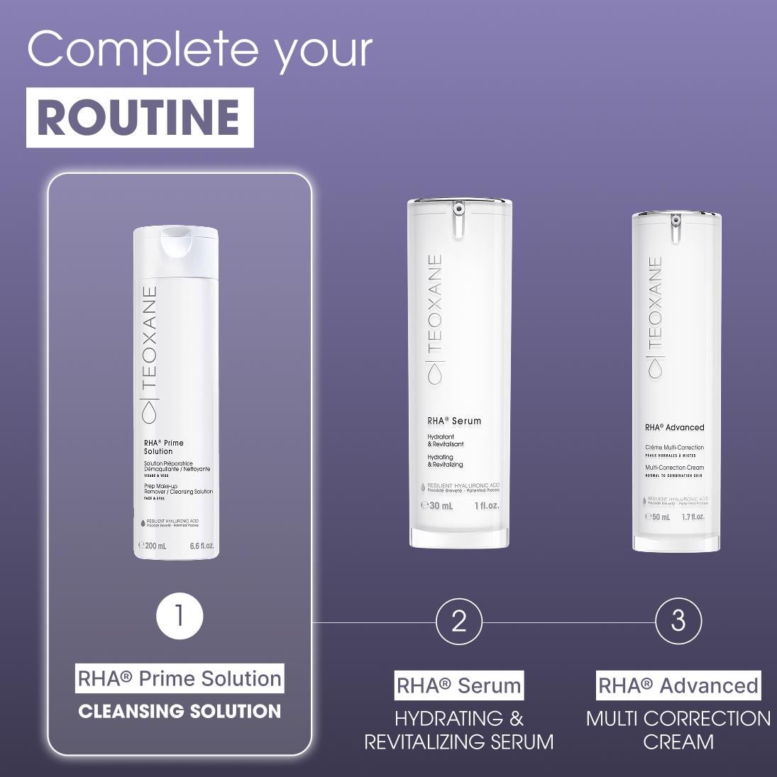 For best results, use RHA® Prime Solution as the first step in your morning and evening skincare routines to cleanse, soothe, and hydrate the skin.¹ Follow with your preferred Teoxane skincare products for optimal hydration and protection.