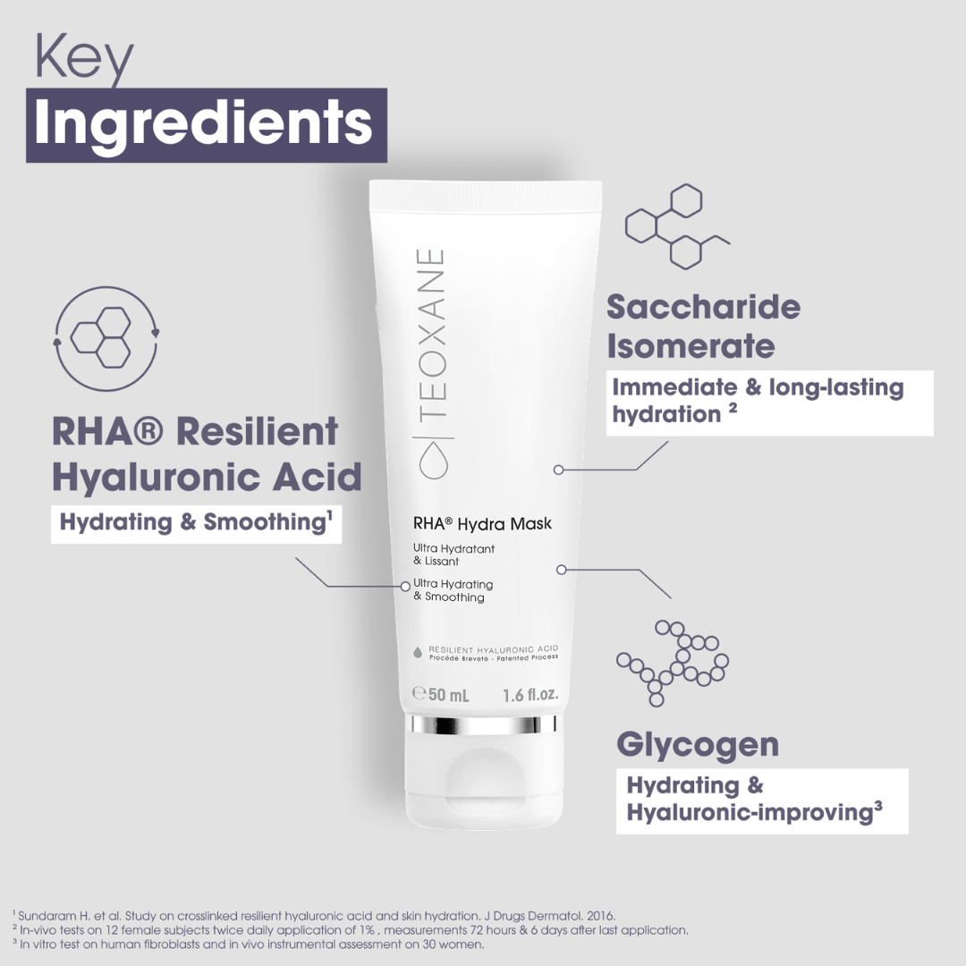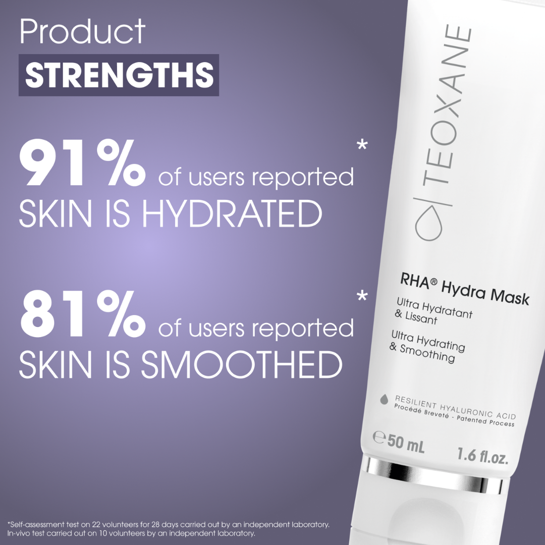 TEOXANE RHA®, a crosslinked hyaluronic acid from our patented process, for optimal hydration and anti-ageing effect. Formulated according to a patented process, our unique technology forms a porous breathable mesh on the surface, trapping water and maintaining superior hydration when compared with linear hyaluronic acid***: